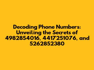 Hey guys! Ever stumble upon a phone number and wonder where it's from or who it belongs to? We've all been there, right? Today, we're diving deep into the fascinating world of phone numbers, specifically focusing on some intriguing ones: 4982854016, 4417251076, and 5262852380. We'll be doing some serious detective work, so grab your magnifying glasses (metaphorically speaking, of course!) and let's get started. Understanding these numbers can be like unlocking a secret code, giving us a peek into their origins and potential significance. So, buckle up; it's going to be a fun ride as we explore the digital footprints left by these numbers.